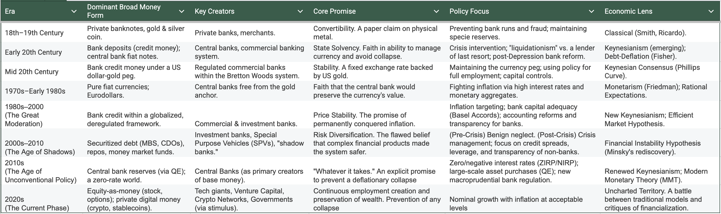 The table below is not just a history of money. It is a history of crisis response. Each era’s unique form of "broad money" dictated the unique form of its eventual bailout. The final row is not a history; it is a prophecy of the tools that will be deployed next (readers may need to zoom in to read the table captured in the image. The table displays how monetary history has changed and why each phase has led policymakers to take steps unforeseen by previous generations. This will be the case when the need arises next time.