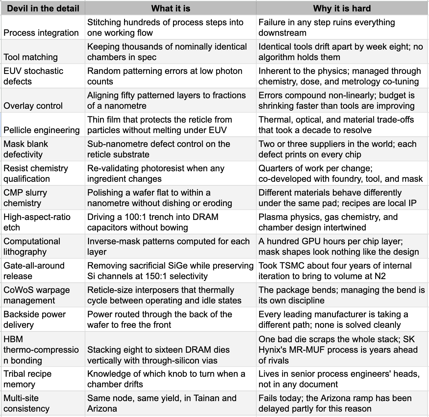 The lesson the catalog does not teach is that the equipment, even when assembled in a multi-billion Dollar clean room, is the easy part. The hard part is everywhere. Most of those problems are not solved by buying a tool. Each is solved by tens of thousands of correction loops, accumulated over decades, written in process documents that no single engineer carries in their head and no rival can copy by hiring twenty defectors. The table below covers some of the more devilish operating challenges that even with the best equipment up and running.