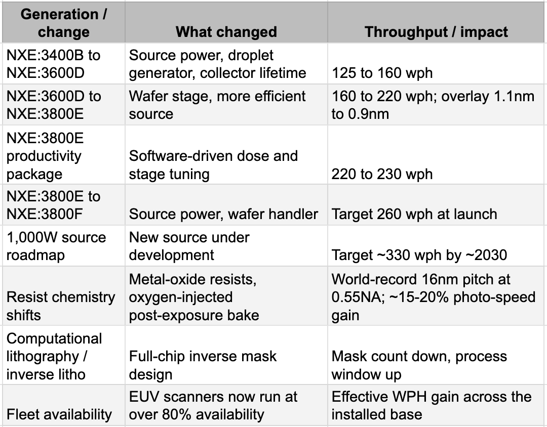 TSMC’s narrative implies a break from ASML’s pricing power, but the reality is an inescapable tether. Extending the current generation of EUV scanners is not a solo endeavor; it requires deep, continuous, and highly expensive collaboration with the manufacturer. When TSMC upgrades an NXE:3800E scanner from 220 to 230 wafers per hour, ASML doesn't send a technician with a wrench. ASML sends a software key. That upgrade is sold as a premium productivity package. The new resists require multi-year qualification loops with ASML. The replacement parts, the laser maintenance, the optics calibration—it is a closed ecosystem. The cumulative effect is that a 2020-vintage EUV tool, fully upgraded, runs roughly twice as productively in 2026 as it did at delivery, but ASML has monetized every single step of that evolution.